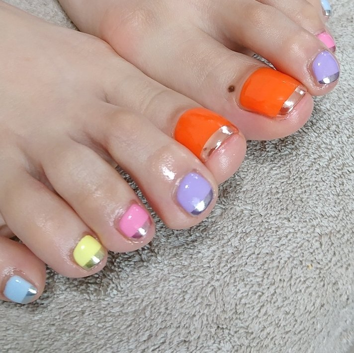 ひまわりフット 13,090円 水面アートフット 13,090円 コッパ―カラーのニュアンスxミラー 13,090円 グレー系タイダイxミラーフット 10,0円 クラッシュシェルとダークグリーンフット 9,790円 New 誕生石ネイル 7月 ルビー 13,090円ピンクミラーネイル ピンクカラーにミラーネイルとラメを合わせてデザインです。 質感の違う3種類を合わせてデザイン性を出しています。 左右で配置を変えてあえて親指には違うデザインを入れました。 左右の親指を変えるのはとってもおしゃれです。 次回も素敵なネイルをおつけしますね♡ ほんでほんで こちらはいつもご来店頂いているk様のフットちゃん 今回はお時間の関係もあり、「お任せします♡」と嬉しいお言葉を頂いたので、元気なショッキングピンクにビビットなカラーでピーコック(*´ω`*)